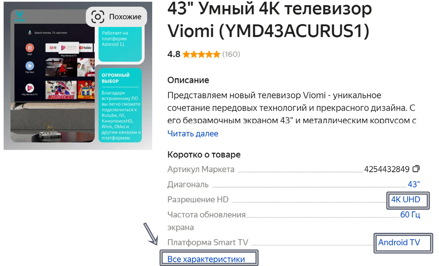 Например, здесь мы видим, что в телевизоре операционная система Андроид, качество 4К (Ultra HD). Чтобы посмотреть больше информации найдите на странице товара пункт с характеристиками.