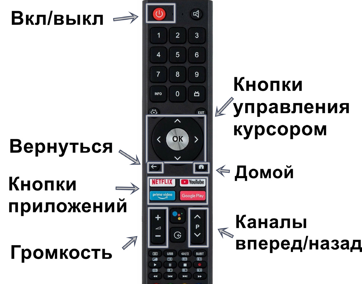 В каждом телевизоре есть раздел настроек, приложения, магазин приложений. На каждом пульте есть основные кнопки управления: