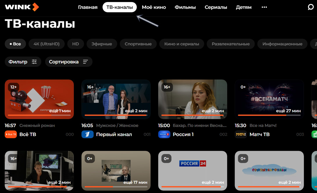 Чтобы посмотреть ТВ-каналы нужно перейти в онлайн-кинотеатр. Это может быть Wink, Кинопоиск, Okko, Kion, Старт, Амедиатека, IVI и т.д.