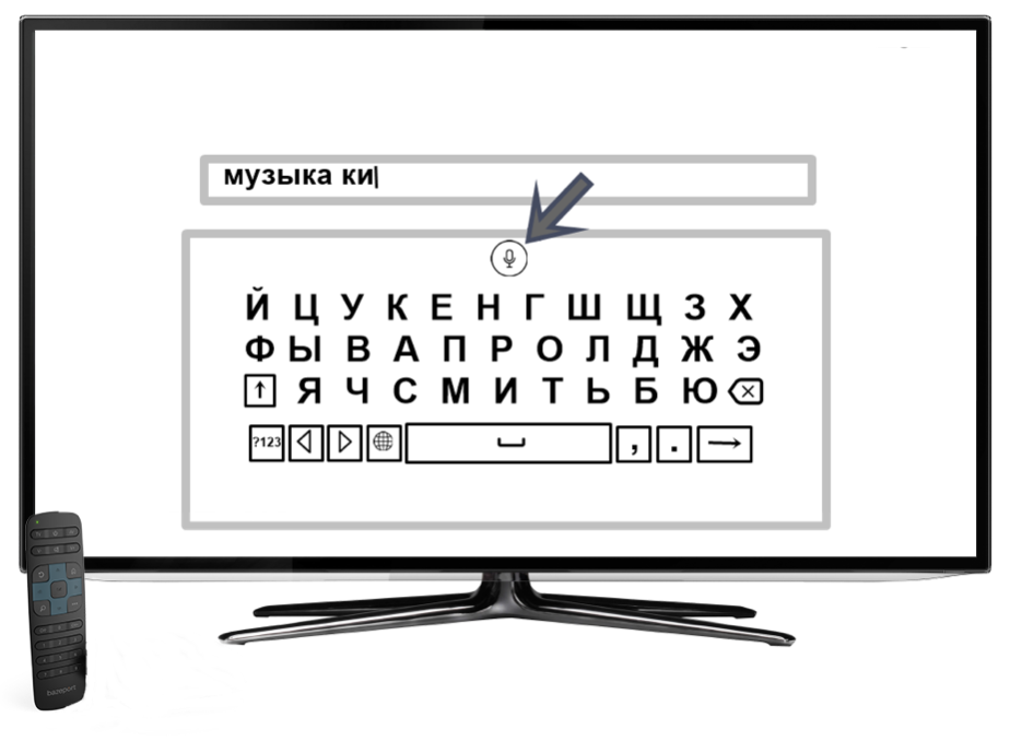 При наборе запроса, когда вы устанавливаете курсор в начале строки, появляется клавиатура. Она похожа на клавиатуру на смартфоне и на компьютере. Но есть еще кнопка «микрофон» . Если на нее нажать, вы можете озвучить запрос голосом. Это быстрее, чем набирать текст. В современные Смарт-ТВ встроен микрофон 3.16.