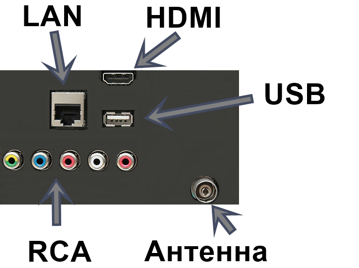 Также есть разъемы для подключения интернета по кабелю (LAN), антенны или кабельного телевидения, наушников, слот для карты памяти. Например, на картинке ниже мы видим разъемы: HDMI, USB, LAN, RCA. В принципе этого набора вполне достаточно.